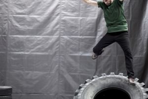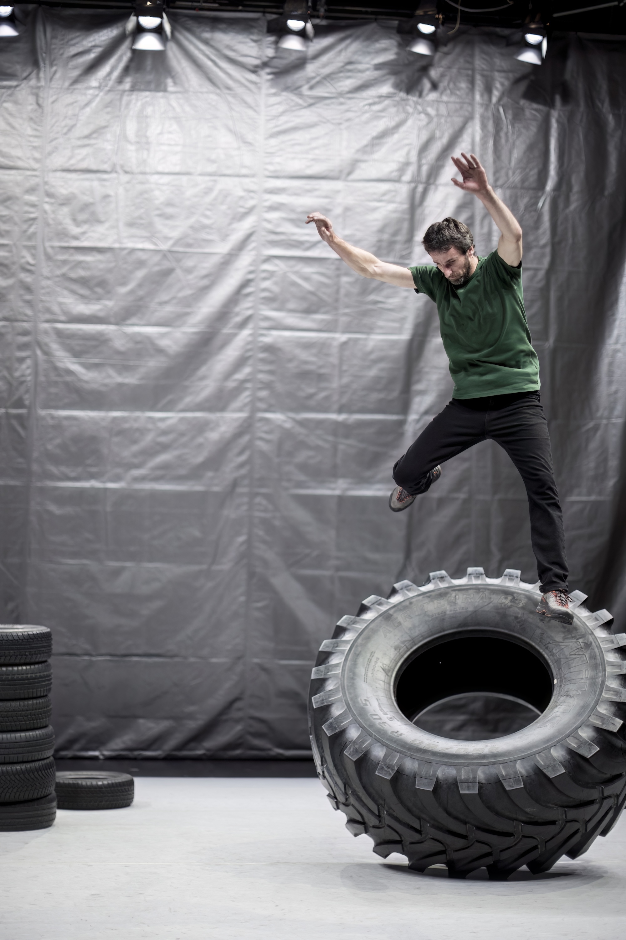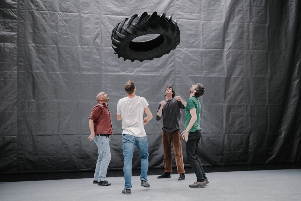 Tires of different sizes lie scattered across the stage. One by one, four performers enter, each attempting to reorganize the space according to their own logic. Their intentions clash, structures collapse, and five hundred kilograms of rubber become both obstacle and partner. Inspired by the concept of anti-fragility by the philosopher Nassim Nicholas Taleb, PNEU explores how bodies respond to pressure.