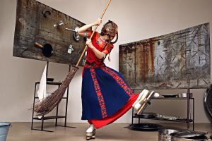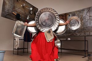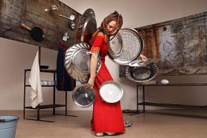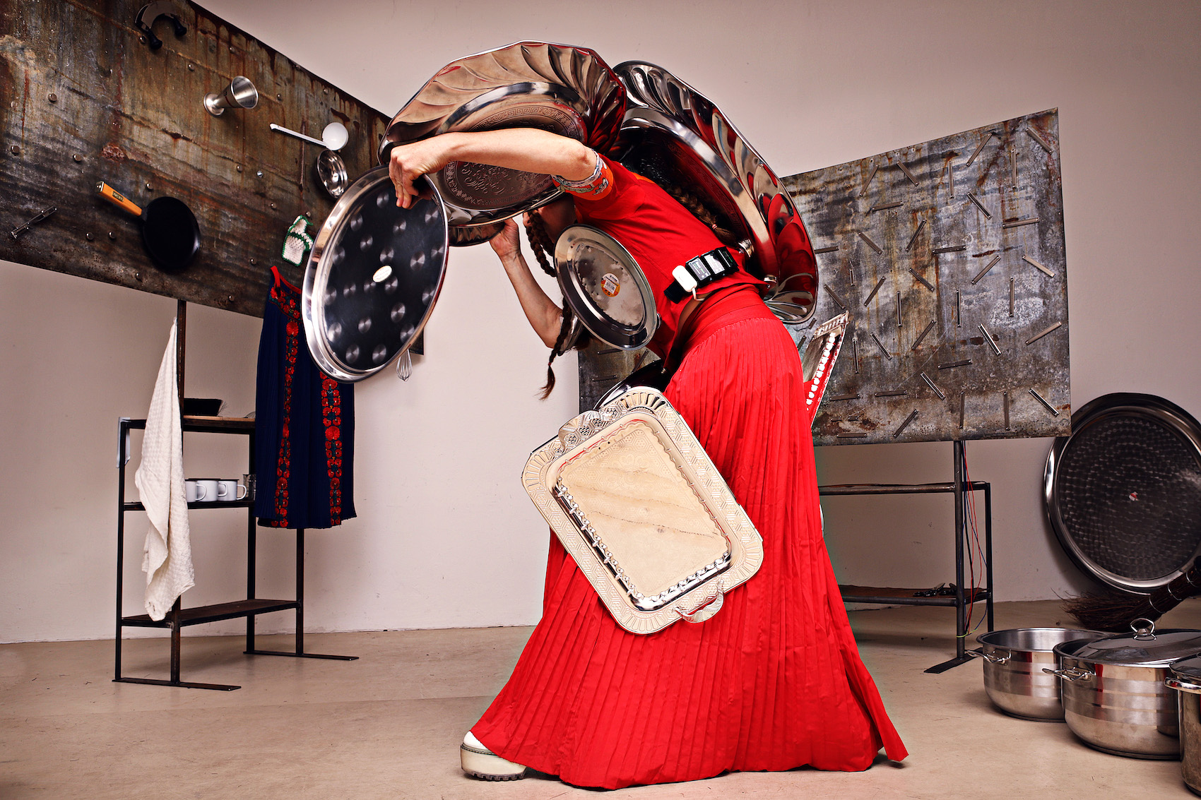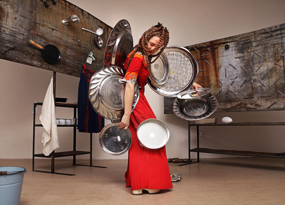 The cooking show begins – there is Racuchy, polish mushroom pancakes. In her new piece, Maren Strack is less concerned with preparing meals than with kitchen utensils themselves. The performer wears a red apron dress to which the neatly sorted kitchen utensils just stick. A dance interplay between the utensils, the costume and the body is created. Gravity seems to be suspended, the appliances develop a life of their own, fly, hit each other, set the dance rhythm – from pianissimo to heavy metal. In a clanging kitchen sound room, she herself mutates into a grotesque cooking-appliance sculpture. She searches for the parmesan and plays on the sounding cheese grater.